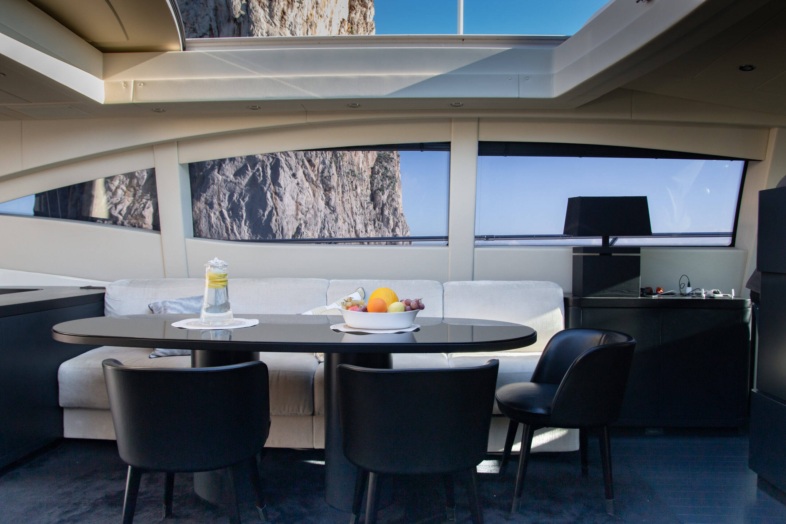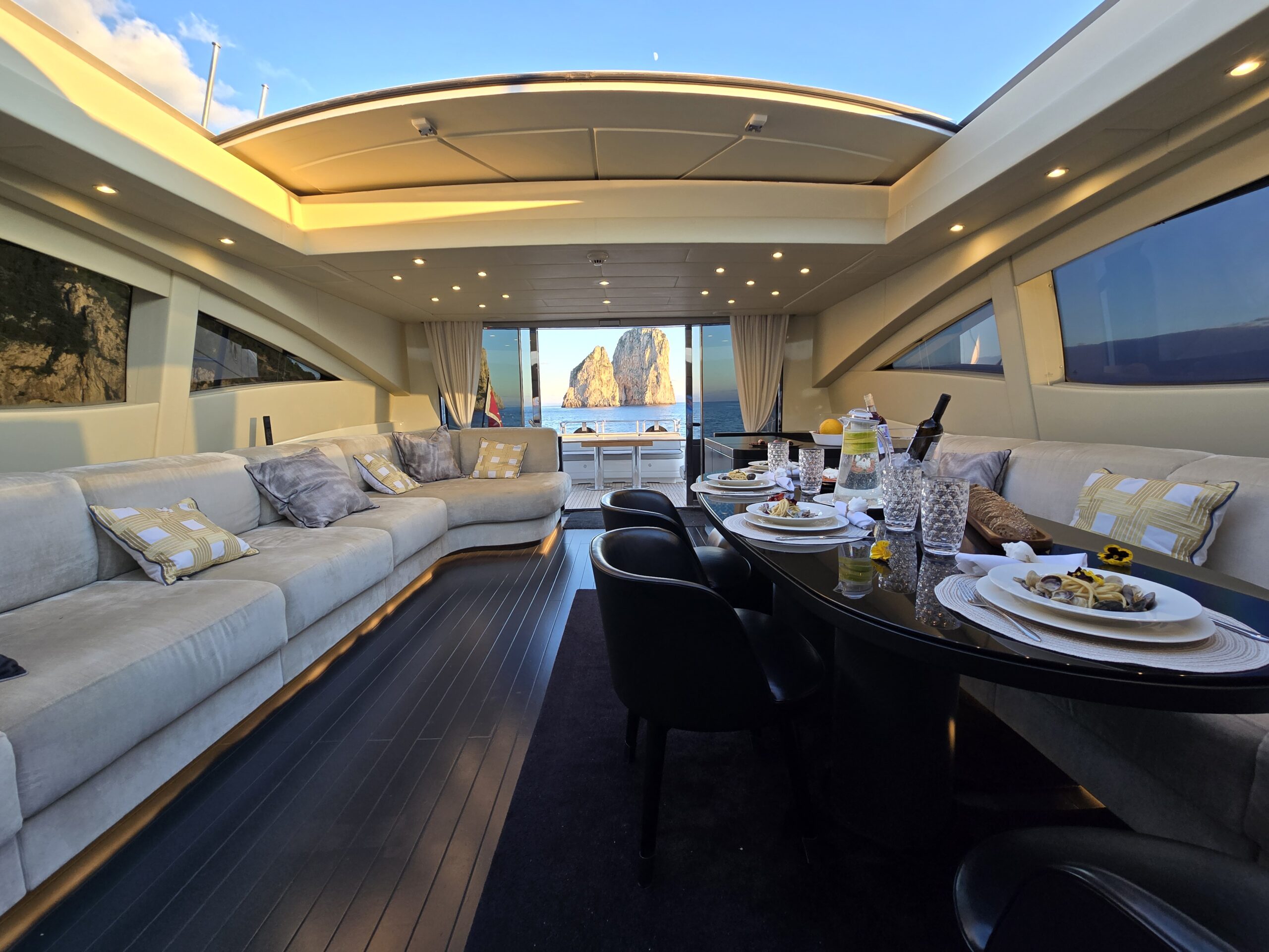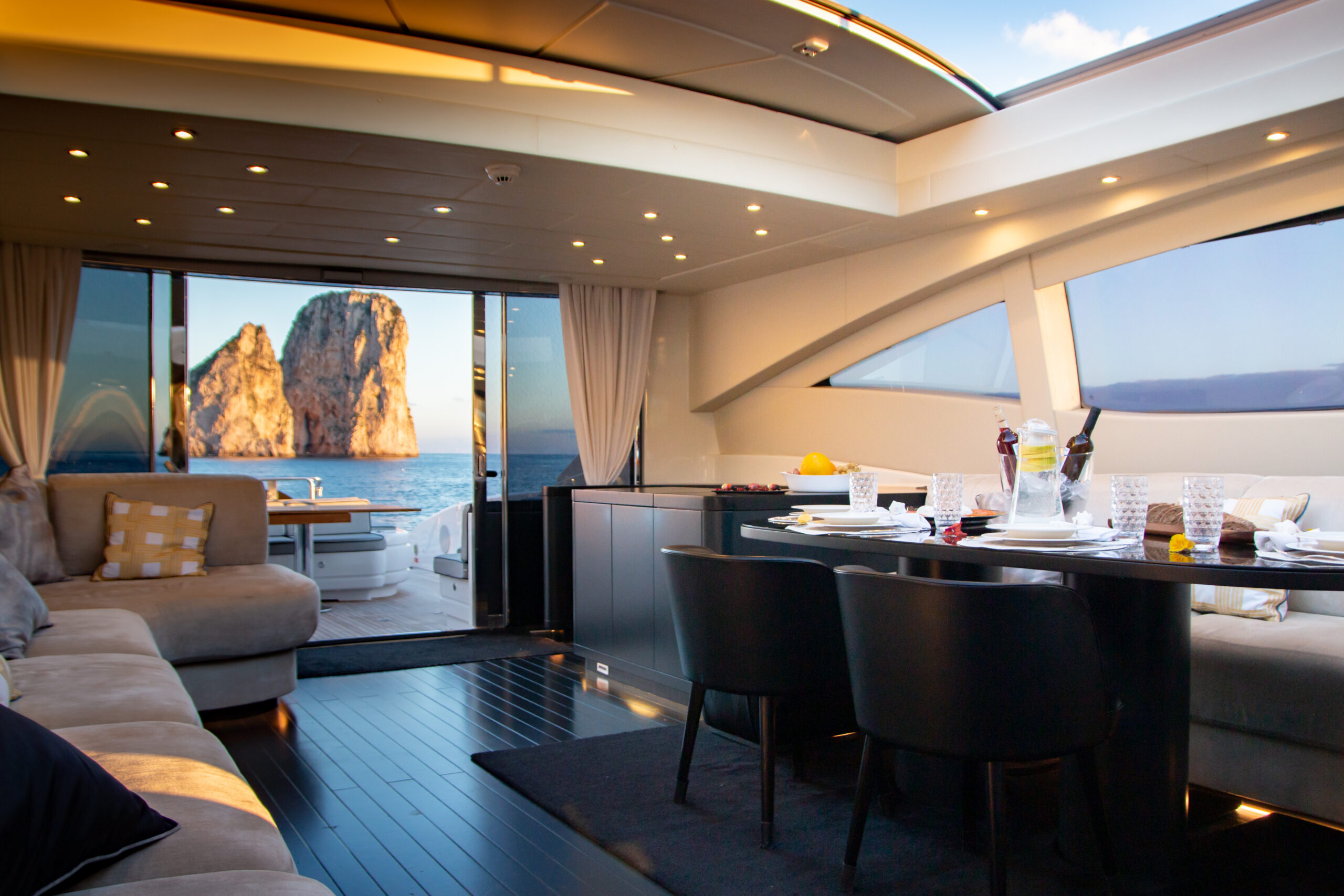 The overall atmosphere is contemporary, elegant and intentionally informal — perfectly aligned with the spirit of an open performance yacht.