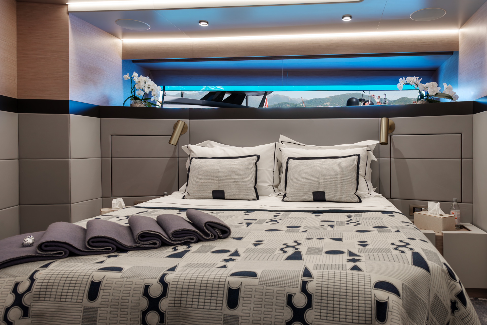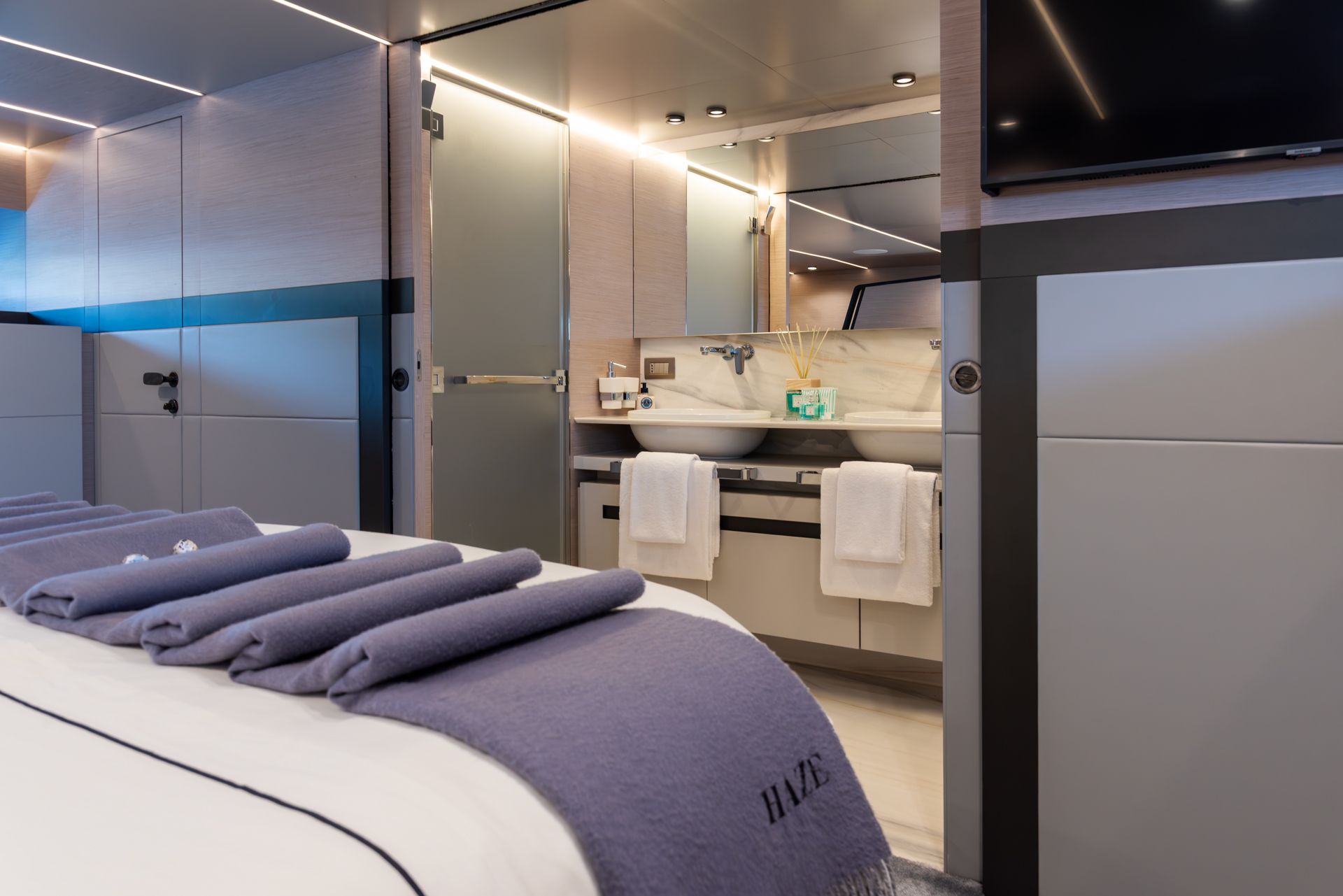 With 86 GT, HAZE offers a spacious layout, accommodating 8 guests in 4 staterooms. The design by Francesco Guida highlights clean exterior lines, while the interior, crafted by Lawson Robb and Francesco Guida, emphasizes panoramic views and thoughtful spaces.