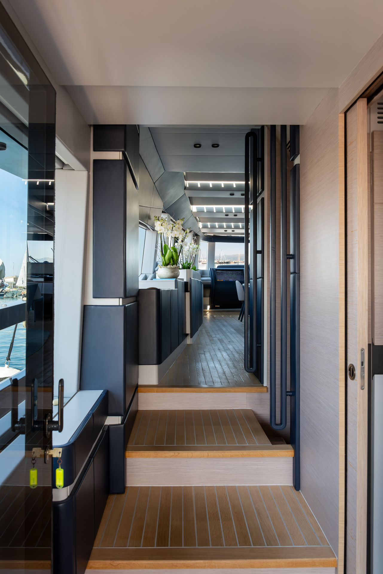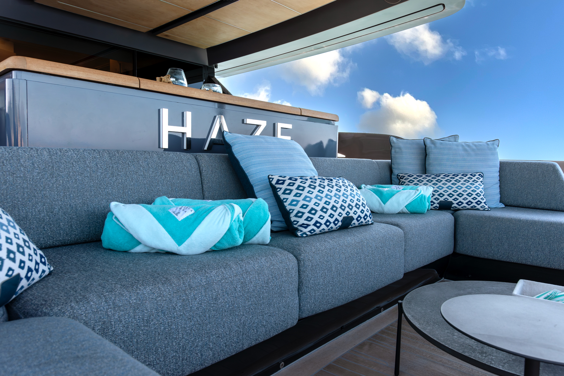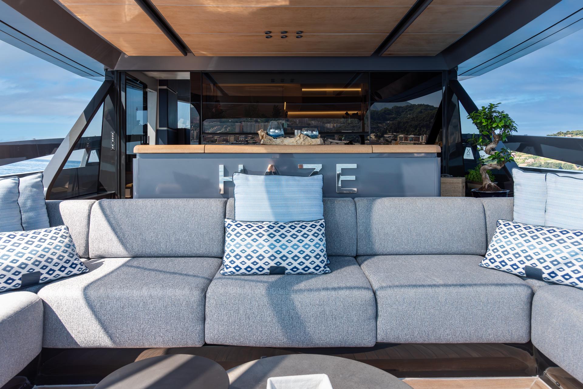 The main salon is bright, welcoming natural light through panoramic windows and a glazed ceiling. Outside, there’s a sizable 50-square-meter beach club with a hydraulic swim platform, along with a flybridge featuring ample seating and sun pads for relaxation. HAZE received recognition for its interior design with the “Interior Design under 40m” award, showcasing its exceptional design and functionality.