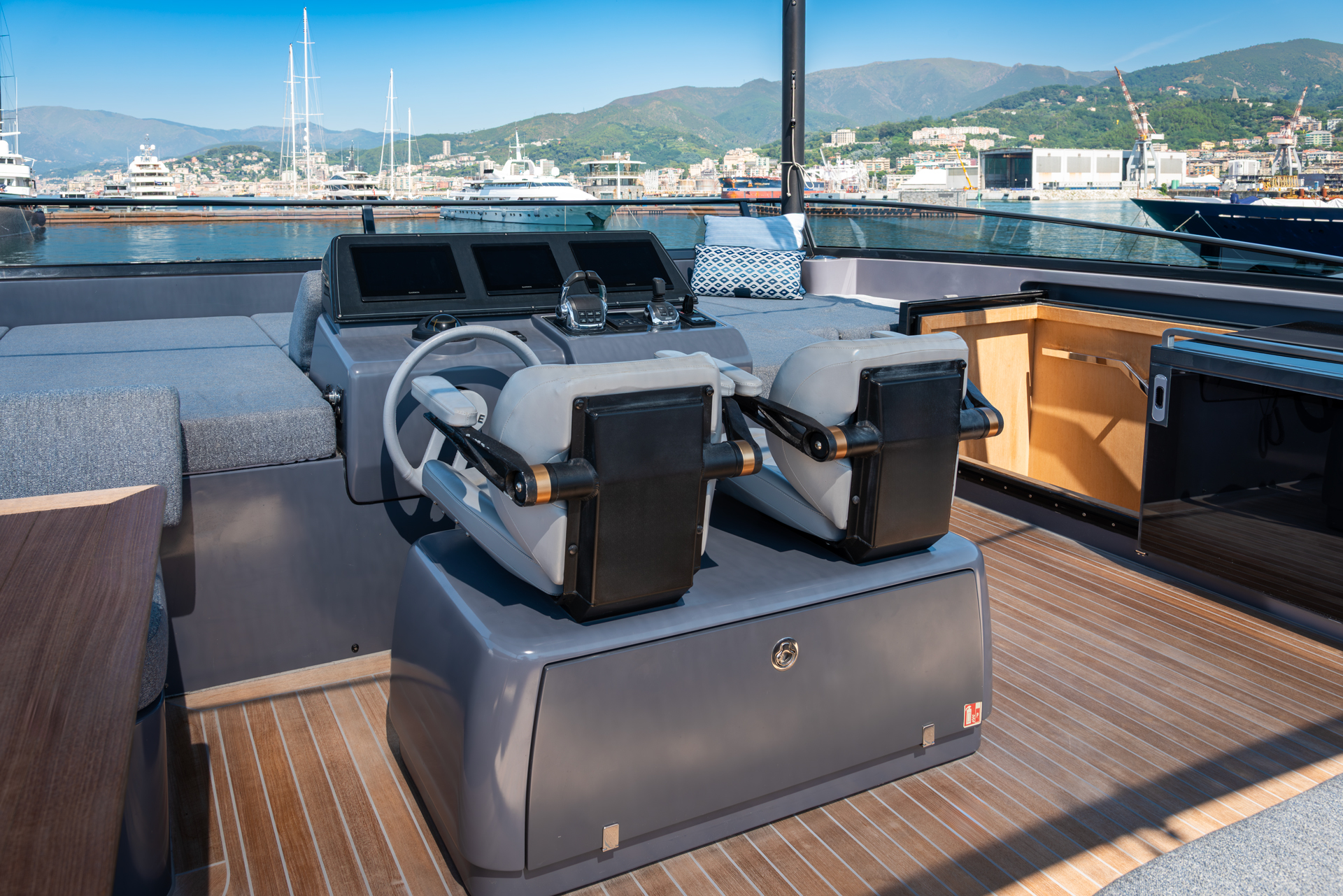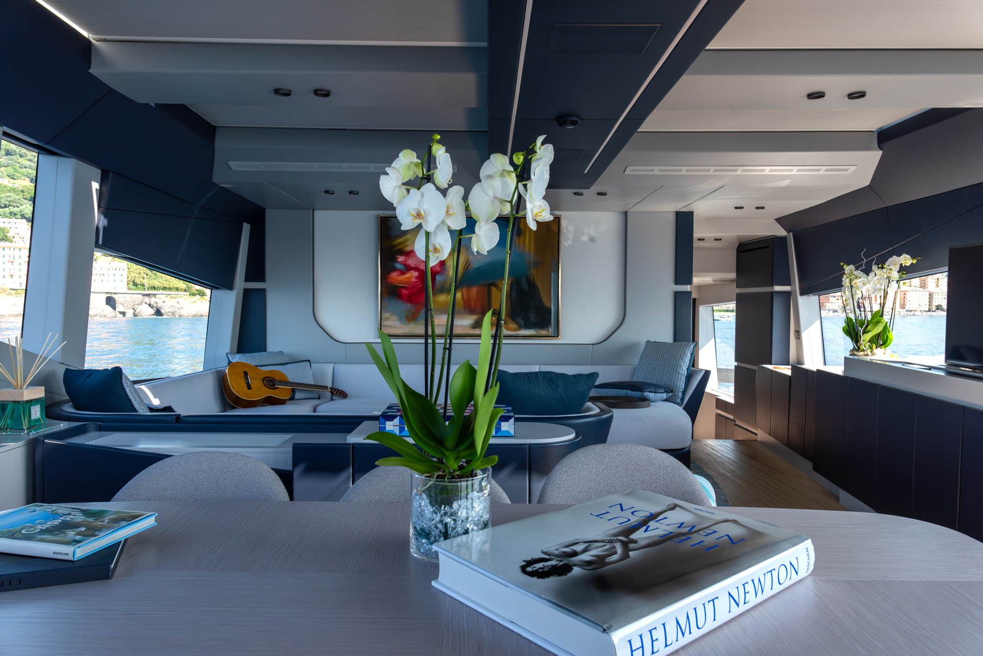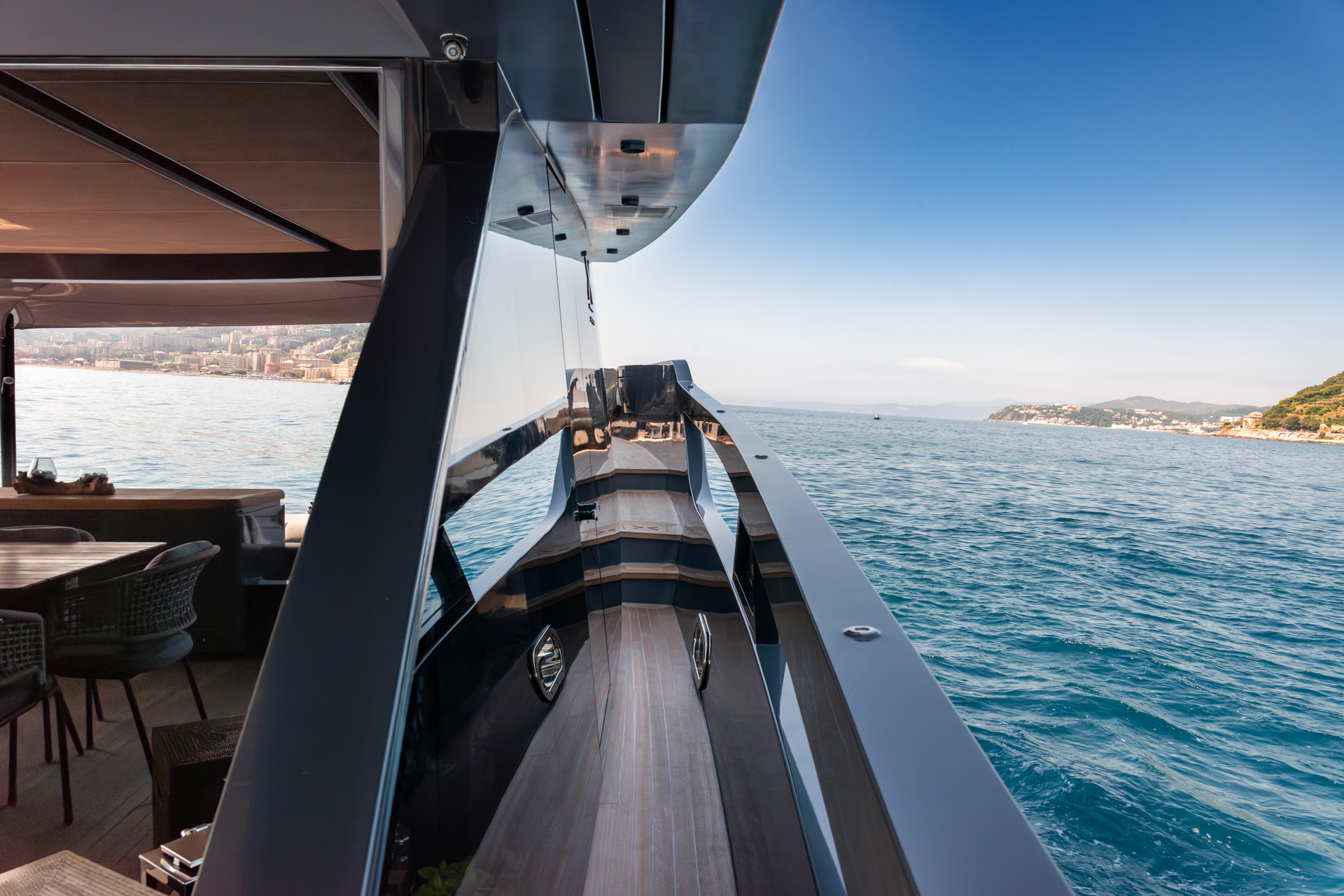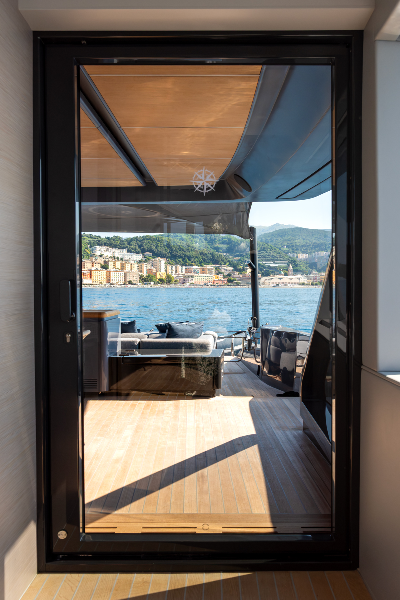 The main salon is bright, welcoming natural light through panoramic windows and a glazed ceiling. Outside, there’s a sizable 50-square-meter beach club with a hydraulic swim platform, along with a flybridge featuring ample seating and sun pads for relaxation. HAZE received recognition for its interior design with the “Interior Design under 40m” award, showcasing its exceptional design and functionality.