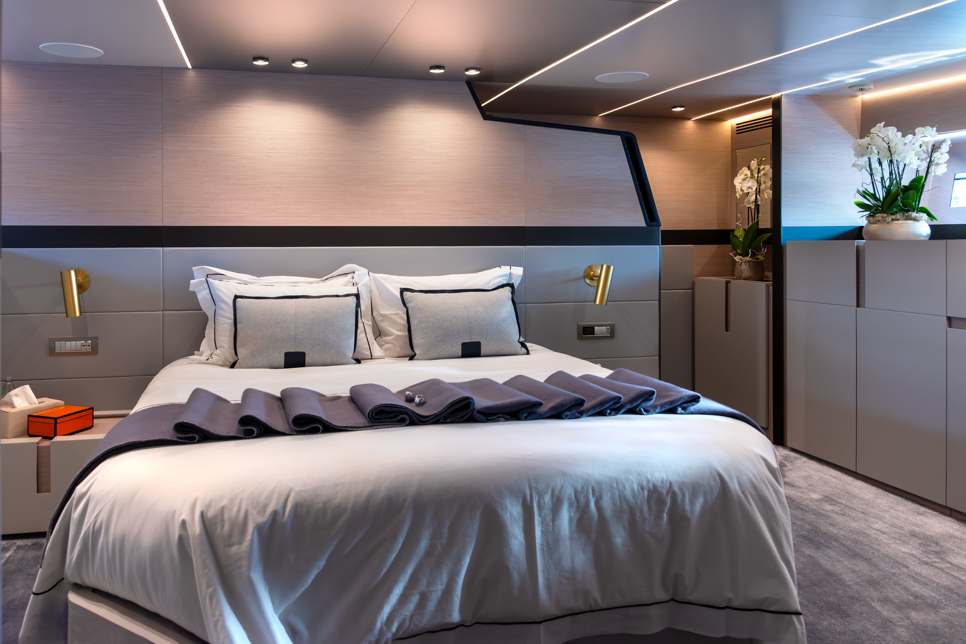 This yacht is impressive in performance, reaching a maximum speed of 21 knots and comfortably cruising at 12 knots. It incorporates photo-voltaic cells for sustainable energy generation, showcasing an eco-conscious approach to luxury.